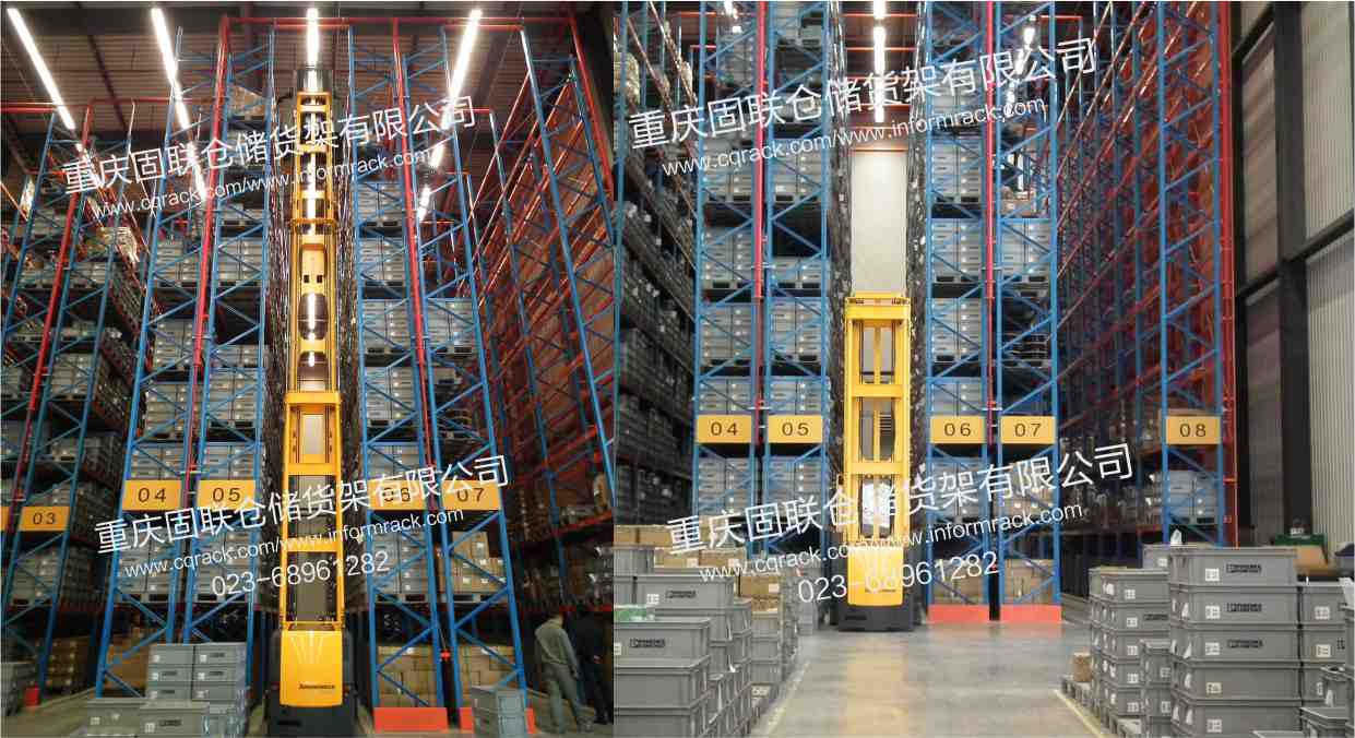 窄巷式貨架的最大特點就是通道比一般的橫梁式窄得多,大概在1600mm-2000mm左右,大大的提高了倉庫的空間利用率,在房價飛漲的今天,窄巷道貨架被很多企業倉庫所喜歡; 這款貨架需要配置專門的叉車---三向堆垛車。