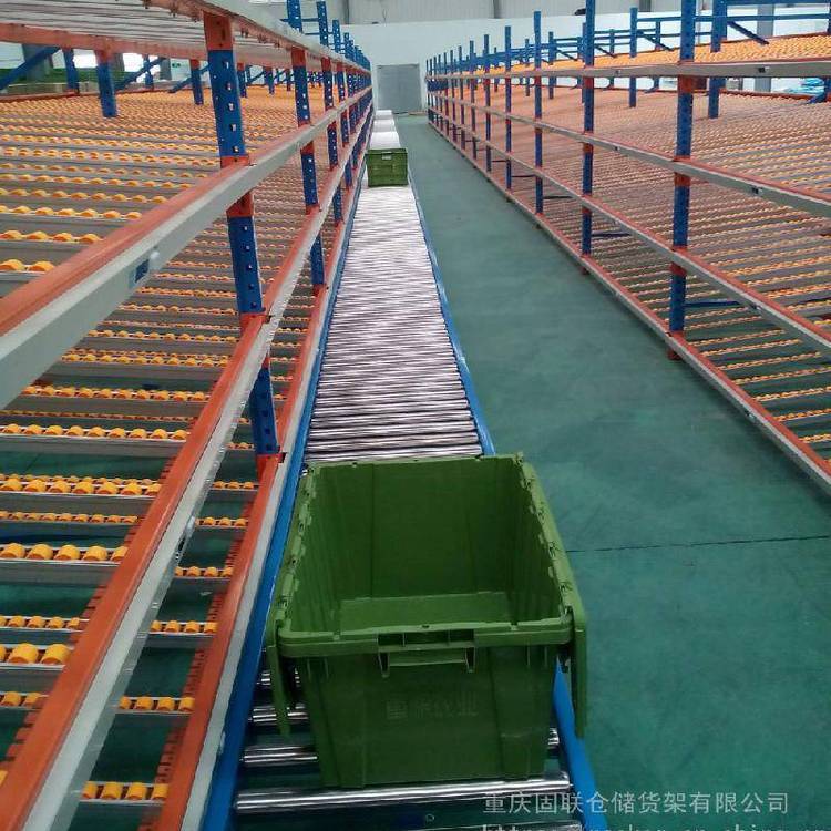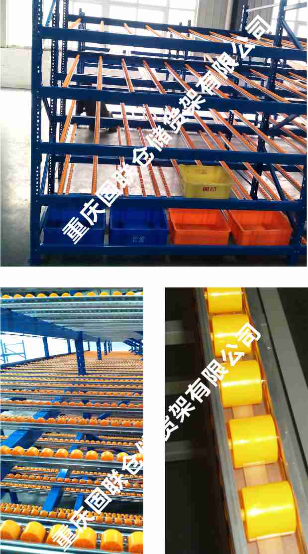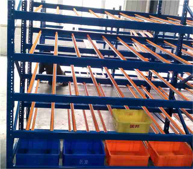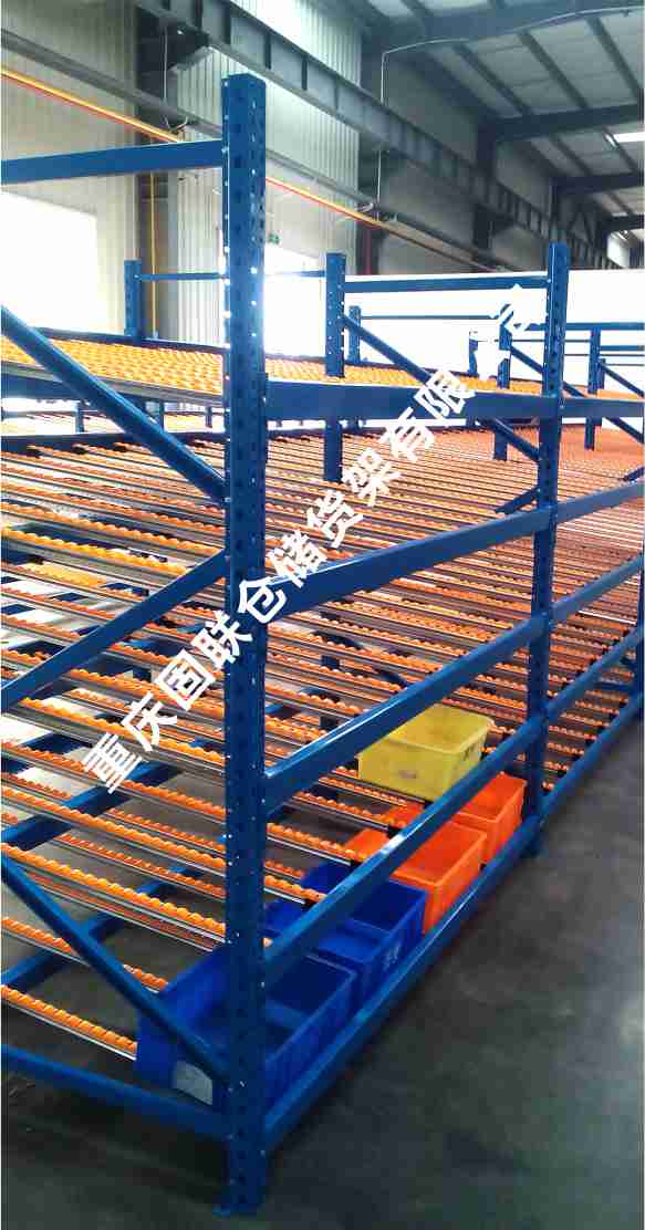 滾輪式料架簡稱流利架,是將貨物置于滾輪上,利用一邊通道存貨,另一邊通道取貨。料架朝出貨方向向下傾斜,貨物在重力作用下向下滑動?蓪崿F先進先出,并可實現一次補貨,多次揀貨。流利架存儲效率高,適合大量貨物的短期存放。
